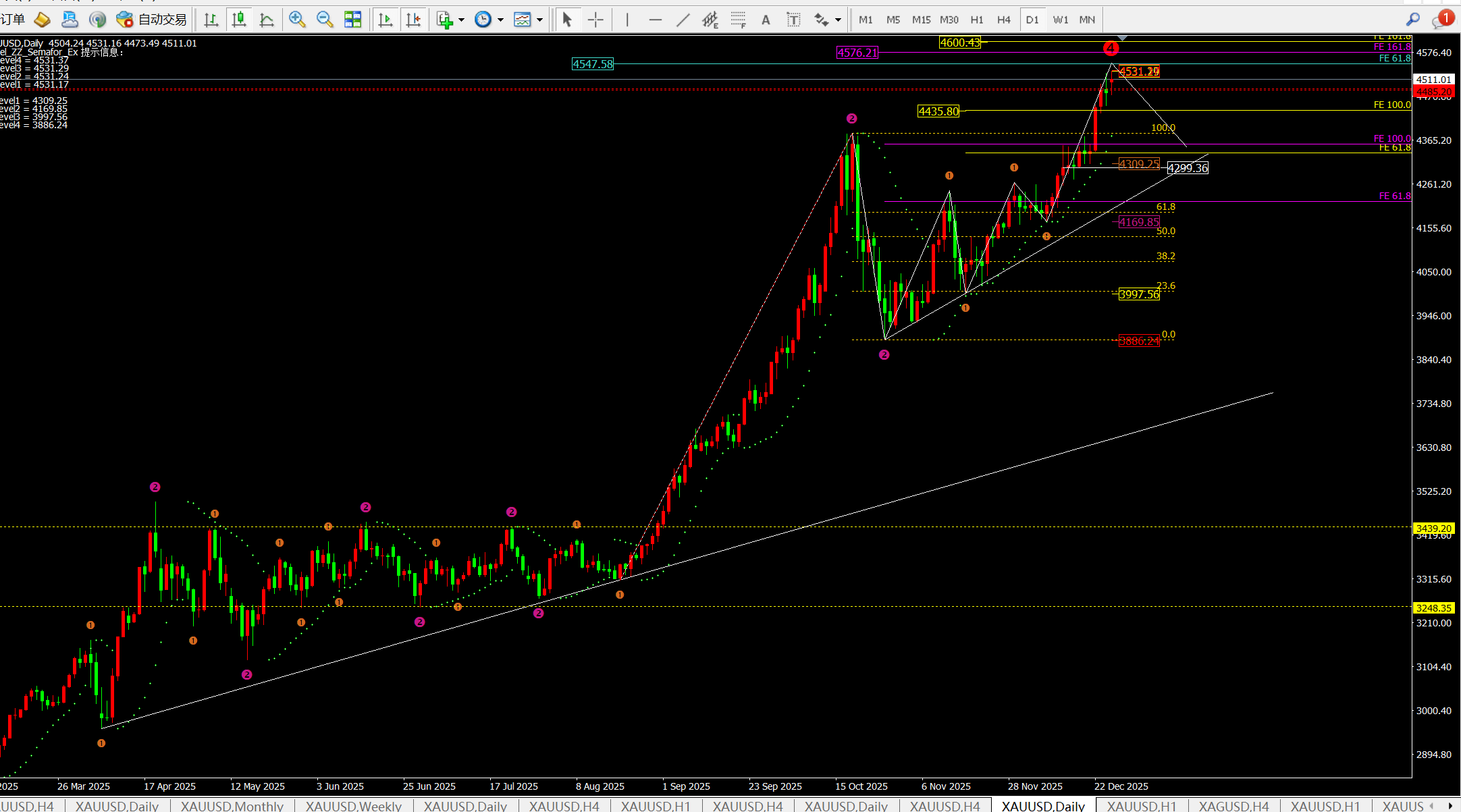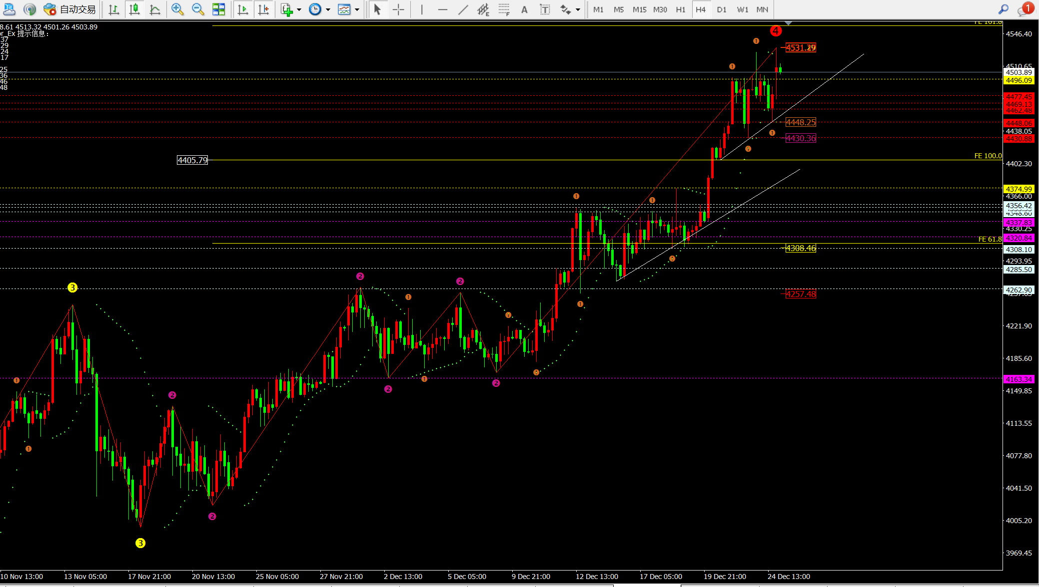日线继续保持多头震荡-,目前关注4450附近的支撑点▽○,而做多点需要在4450上方去布局●-。如果下破将直接到达4380-4410附近◇。