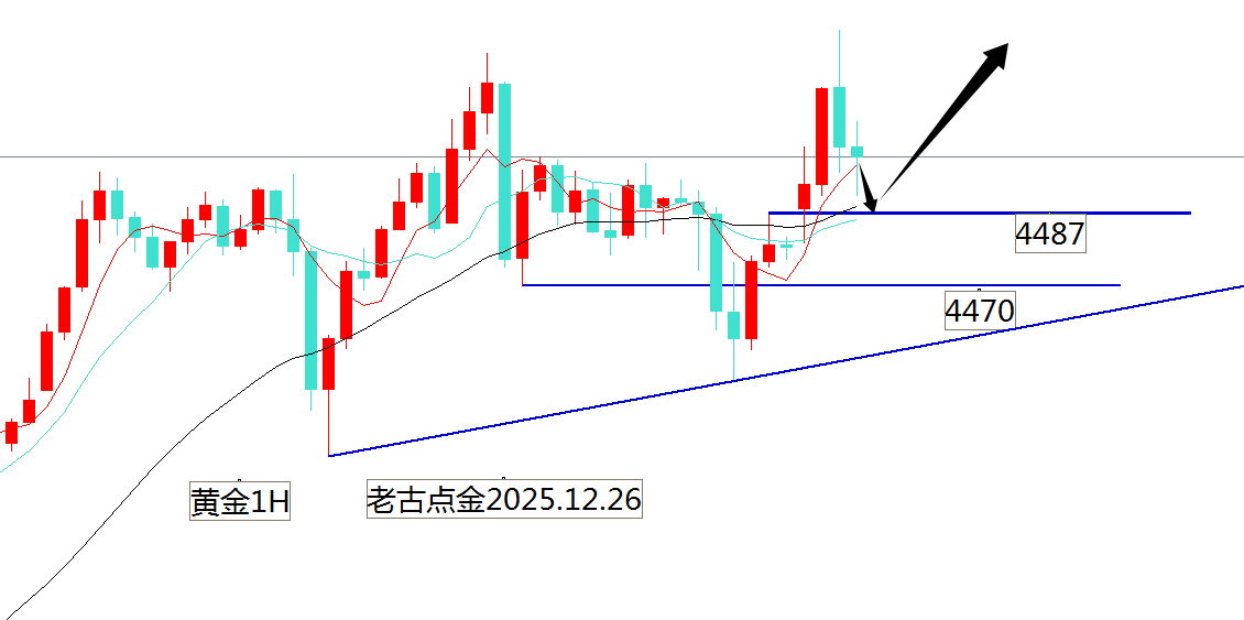 圣诞节假期昨天没有开市◆=•,而且今天还有很都国家都还是在放假中,但是黄金没有因为节假日保持温和,而且是开启来来的狂洗模式,周三的黄金冲高大回落,我们布局的4500空被打出局后马上又调整模式在4496和4498两次空到4474吃肉…,而且我们博文还明确了4450的底部多单机会△▼,黄金触及到了这个位置再次反弹起来,今天的黄金老古预估还是会继续洗,不管它怎么洗最终的大趋势还是多头还是没有改变的,而且日线的均线还是多头中▽★,之前的高位十字星只是一个高位疲软信号◆☆▪,不是见顶信号,而且就算是见顶信号了也是需要时间和空间去筑顶。