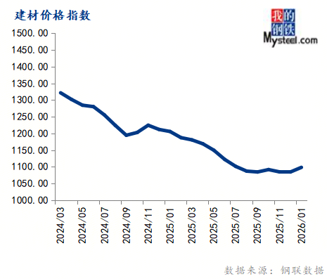 1月份建材价格指数为1098.43,环比上涨1.27%,同比下跌8.90%。