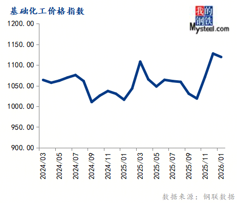 1月份基础化工价格指数为1119.47,环比下跌0.73%,同比上涨10.16%。