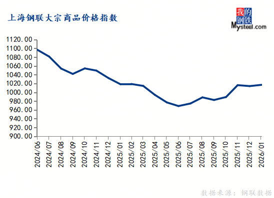 2026年1月份,上海钢联中国大宗商品价格指数(MyBCIC)终值为1016.95,创下2025年3月以来新高;同比下跌0.14%,降幅较上月明显收窄;环比上涨0.29%,全月呈现“M”形窄幅波动走势。